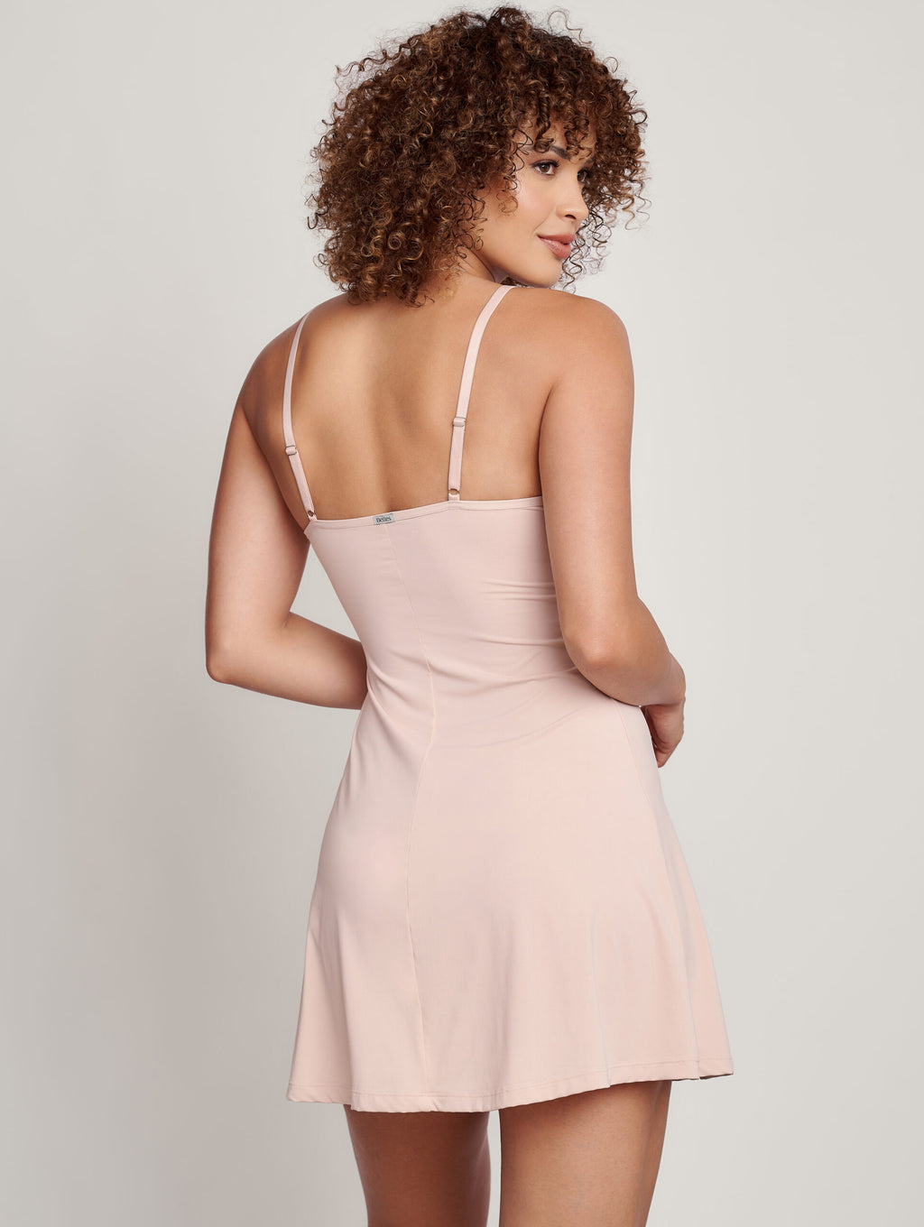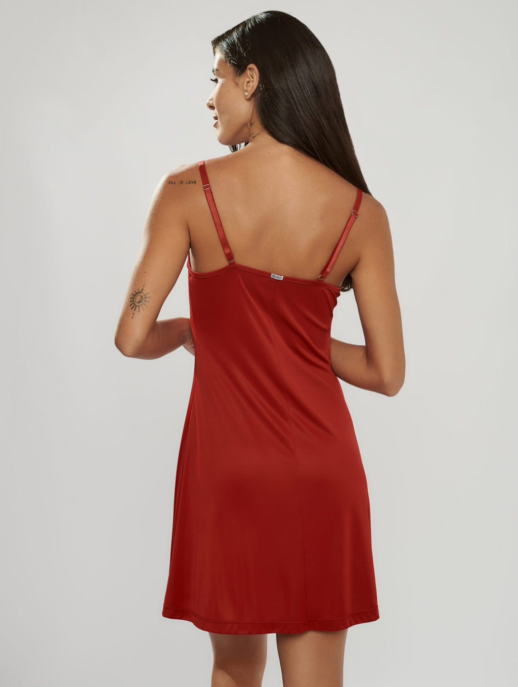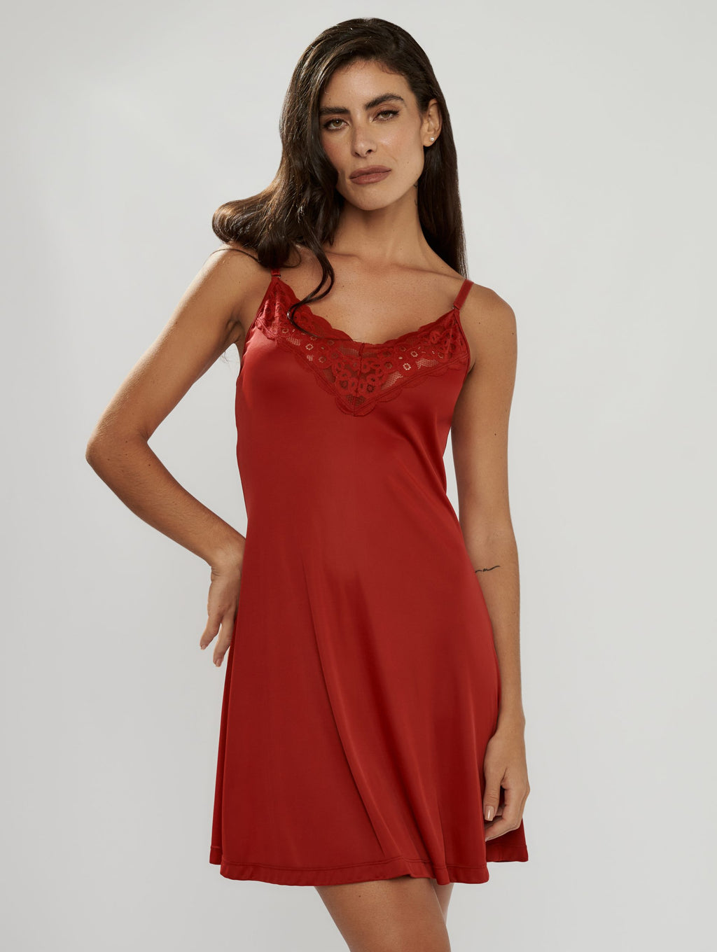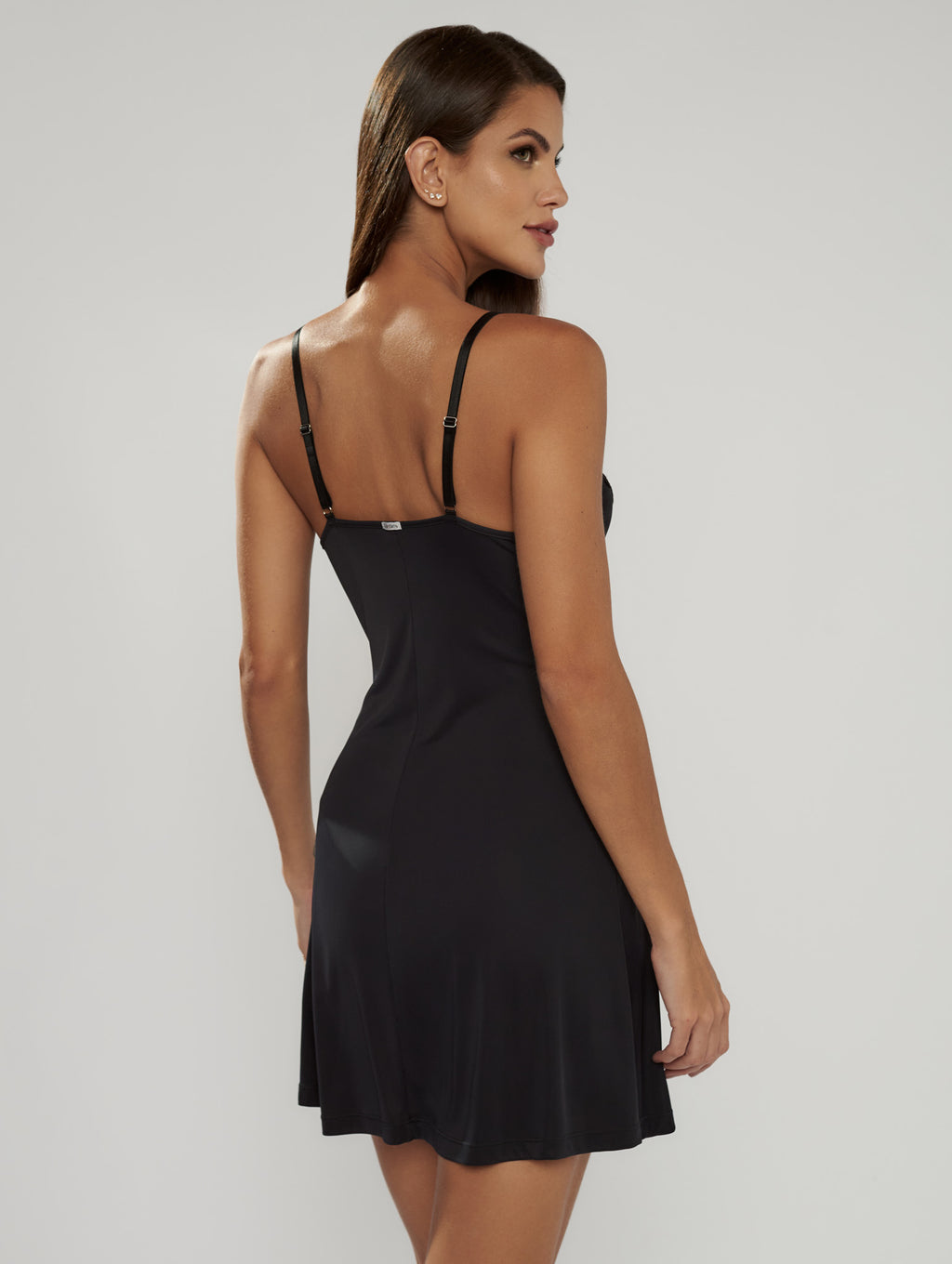 A modelagem curta e o decote em “v” com detalhes em renda transparente adicionam um toque de sofisticação e charme. Alças fixas e reguláveis com metais banhados a níquel garantem um ajuste personalizado e elegante.